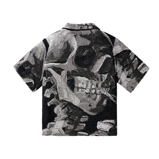 "SKULL OF A SKELETON WITH A BURNING CIGARETTE" TAPESTRY JACQUARD FABRIC ZIP-UP SHIRT